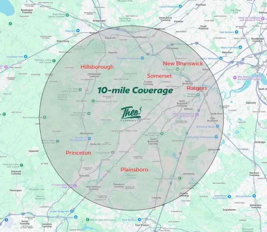 Outside the 5-mile zone but still within 10 miles of the dispensary? We got you. You’ll just need to cover a $25 delivery fee. Same rule applies: the fee is based on your actual distance from Theo, not just your town. So if you’re in New Brunswick or Somerset but a bit outside the radius, the fee still kicks in. Not sure if you’re in range? Give us a call. We’re down to figure it out together.